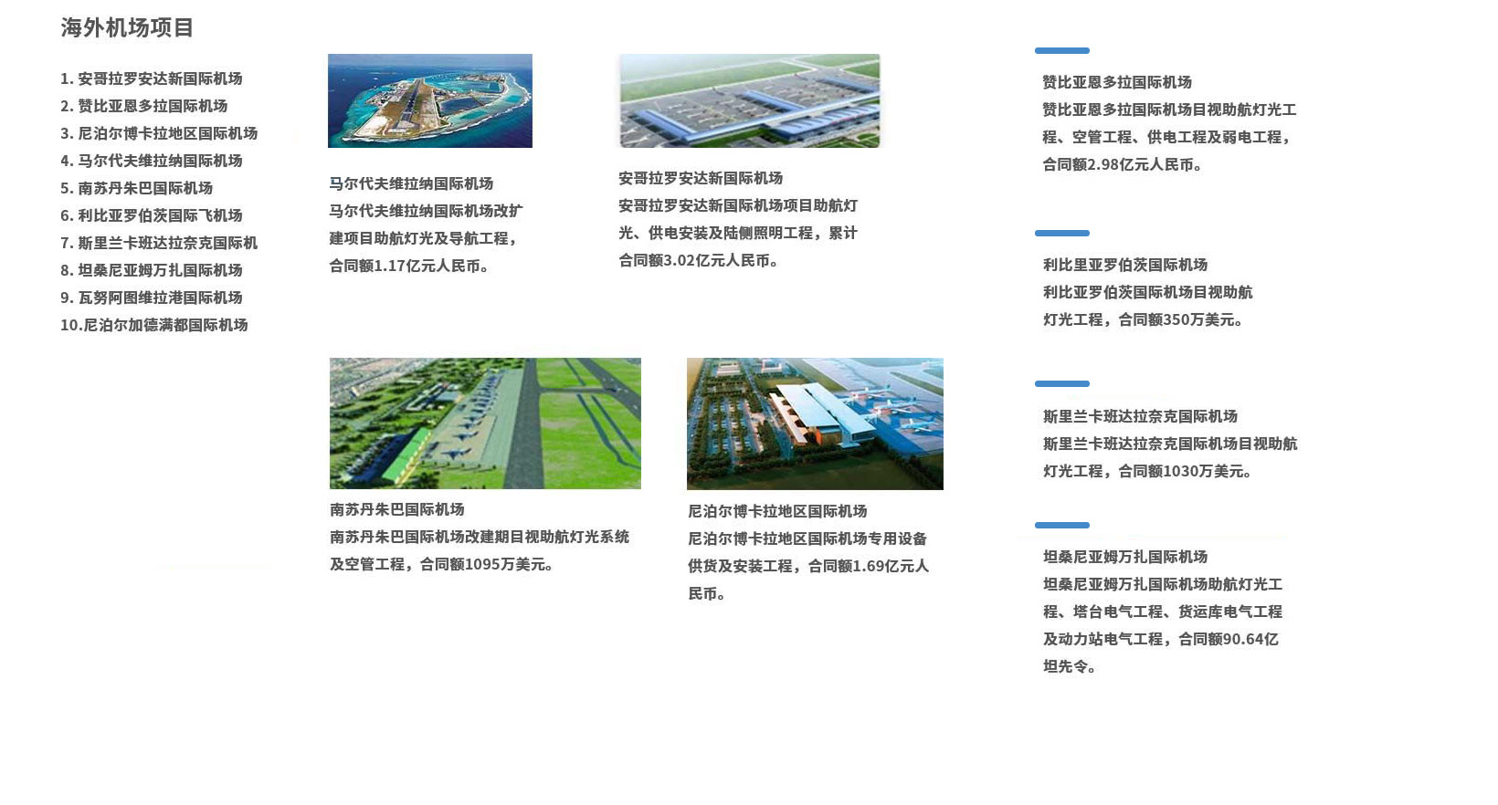 上海浦东国际机场第一至第五跑道助航灯光工程,机场站坪照明工程及围界安防工程,累计合同额7.28亿元人民币。