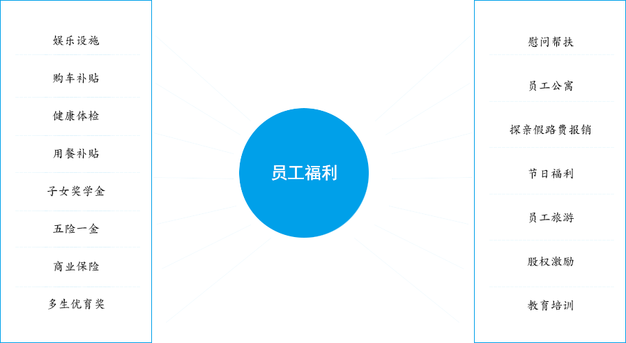 在法定福利的基础上,公司为员工提供全方位的企业福利,涉及到员工衣食住行各个方面,共 计14个大项,21个小项,为员工的生活雪中送炭、锦上添花