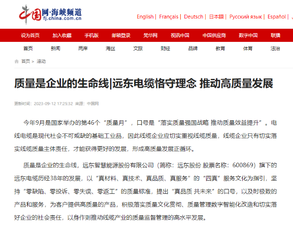 今年9月是国家举办的第46个“质量月”,口号是“落实质量强国战略 推动质量效益提升”。电线电缆是现代社会不可或缺的基础工业品,因此线缆企业应切实重视线缆质量,线缆企业只有切实落实线缆质量主体责任,才能获得更好的发展,形成高质量发展正循环。