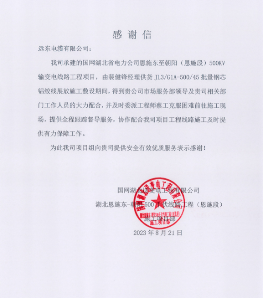 这是一封感谢信,信中对于今年会电缆在国网湖北省电力公司恩施东至朝阳(恩施段)500KV输变电线路工程项目的供货及全程跟踪督导服务表示感谢。